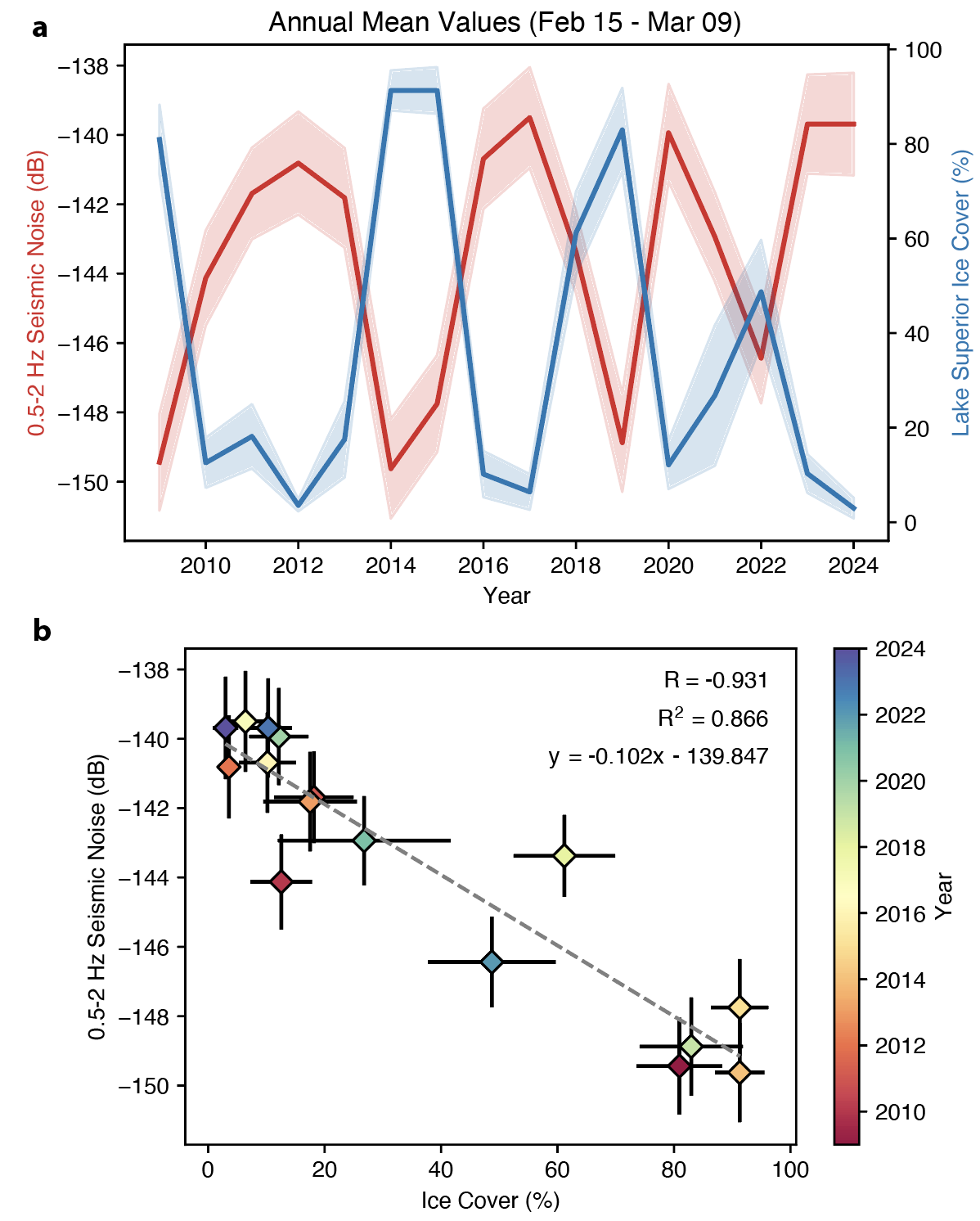 How can seismology tell us about environmental processes? Seismometers measure vibrations occurring at Earth's surface due to people, cars, earthquakes, ocean waves, and a range of other environmental phoenomena. Therefore, seismology can be used as an effective tool for understanding interactions between the solid Earth, cryosphere, hydrosphere, and atmosphere. Many of the tools we develop for imaging the Earth's deep interior using seismic noise can be shifted to higher frequency and repurposed for studying near-surface and environmental problems. We work on problems such as the effect of lake ice on seismic noise and using seismic observations to estimate ice cover.