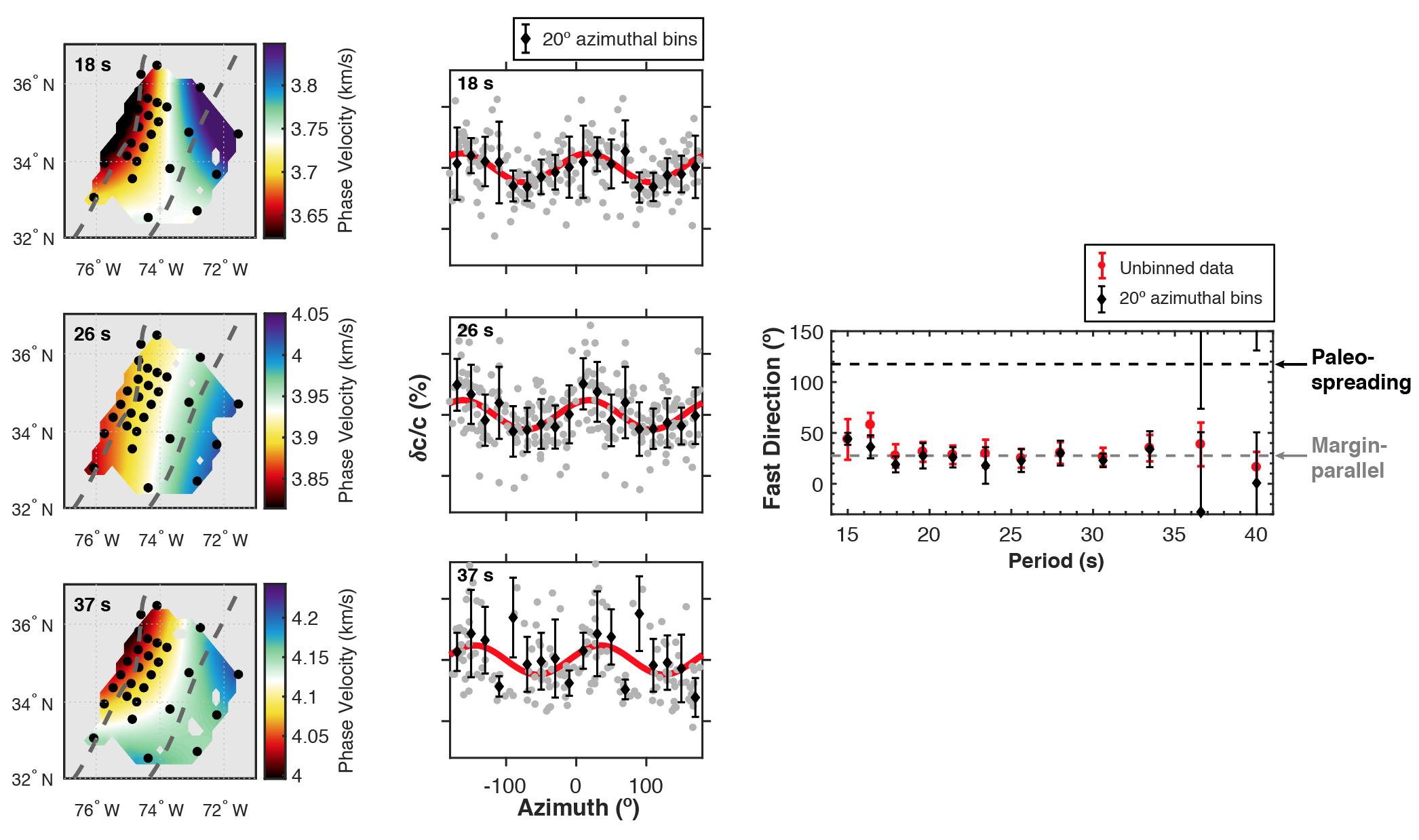 My research involves using ambient noise Rayleigh waves to image the relic flow patterns recorded in the lithosphere during continental breakup. We find azimuthal anisotropy with the fast direction parallel to the coastline, 90ยบ rotated from the paleo-spreading direction. This is at odds with the commonly accepted idea that the lithosphere records anisotropy parallel to the paleo-spreading direction. Our observations may be indicative of margin-parallel flow during the continental breakup. Alternatively, fast translation of the overall system relative to the slower breakup could have caused overprinting of the spreading signal by the plate motion signal.