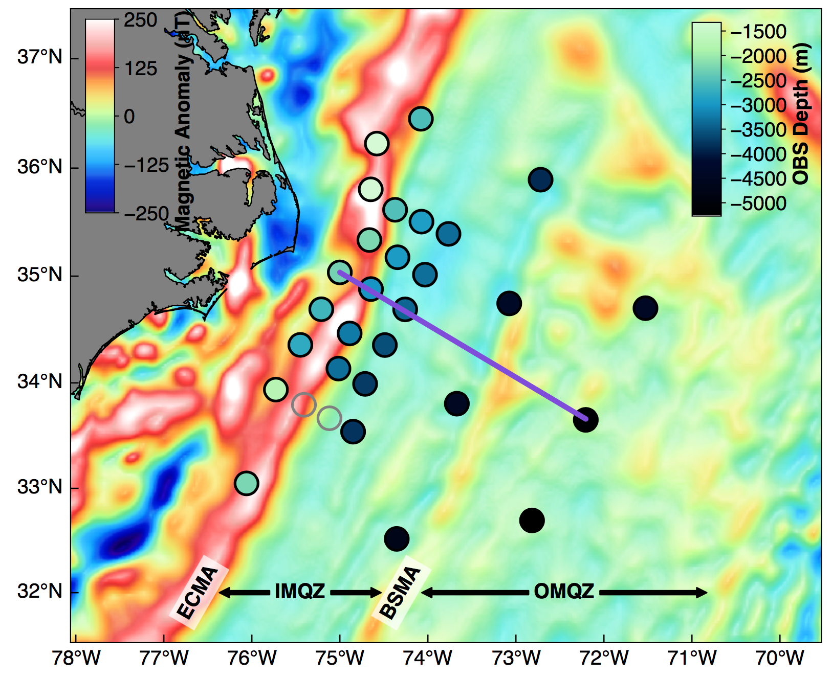 Magnetic anomalies of the ENAM-CSE region with broadband OBS shown as circles and colored by depth. East Coast Magnetic Anomaly (ECMA); Blake Spur Magnetic Anomaly (BSMA); Inner Magnetic Quiet Zone (IMQZ); Outer Magnetic Quiet Zone (OMQZ).